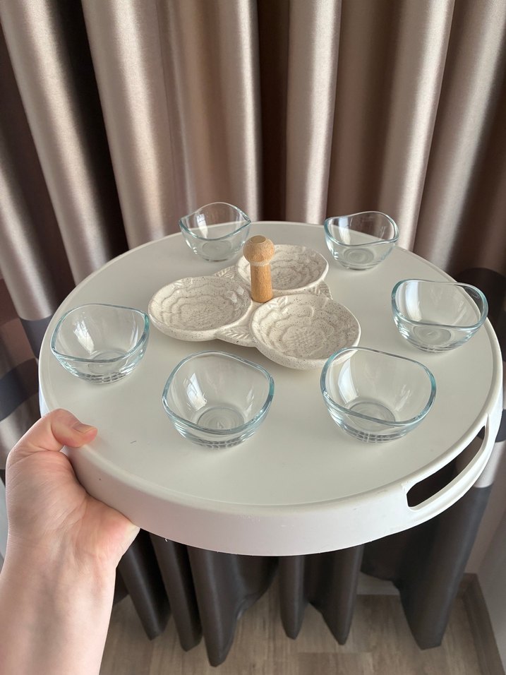 Altı küçük cam kase ve ortasında ahşap saplı seramik tutacağı olan beyaz döner sosluk .komple fiyat