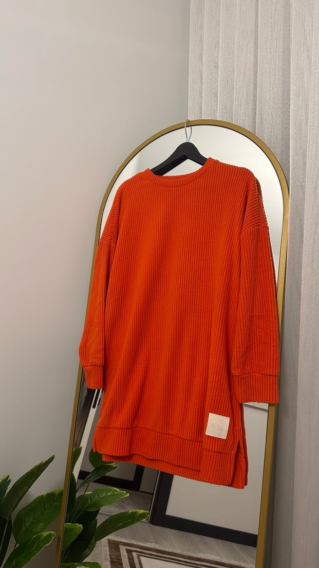 Turuncu triko dokulu, bol kesim kadın sweatshirtü. Uzun kollu, yuvarlak yaka ve midi boyda, yumuşak ve sıcak kumaştan üretilmiştir.