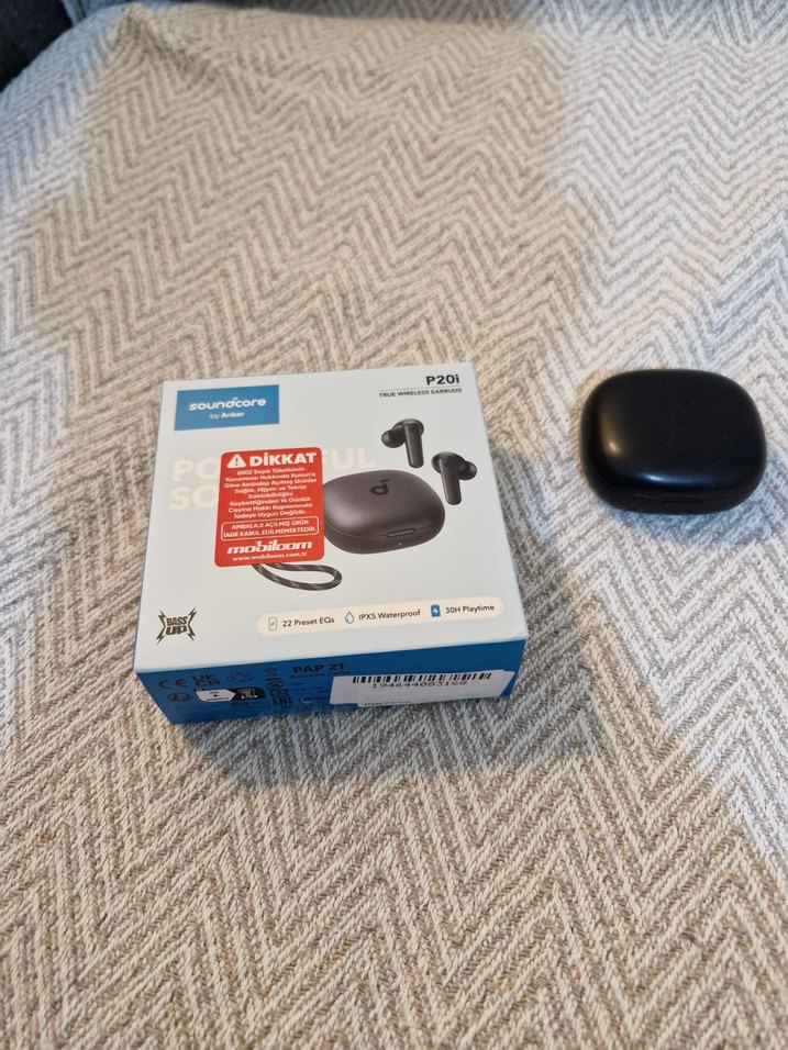 Soundcore P20i siyah kablosuz kulaklık, kompakt şarj kutusuyla birlikte gelir. Bluetooth 5.0 bağlantı ve suya dayanıklılık özelliklerine sahiptir. Garanti suresi hala gecerlidir.