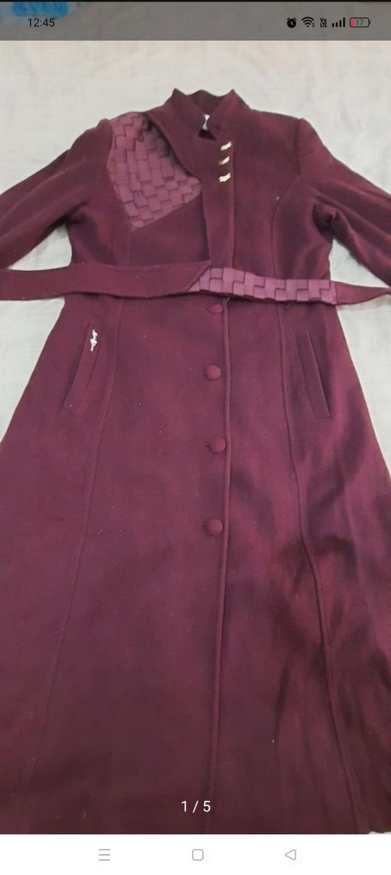 MÜRDÜM renk, düğmeli, uzun boy, klasik tarzda kadın kaban. Sentetik kumaştan, yakası kesik ve kolları ince bantlıdır. Günlük kullanıma uygundur.