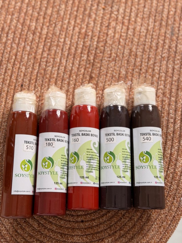 SOYSTYLE tekstil baskı boyaları, farklı renk seçenekleri ve 125 ml şişelerde kumaş için üretilmiştir. 11 adettir