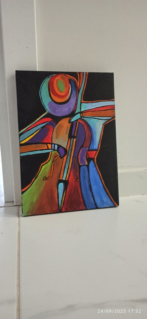 Soyut çok renkli şekillerle keman ve yayın bulunduğu koyu zeminli tablo. 25-35