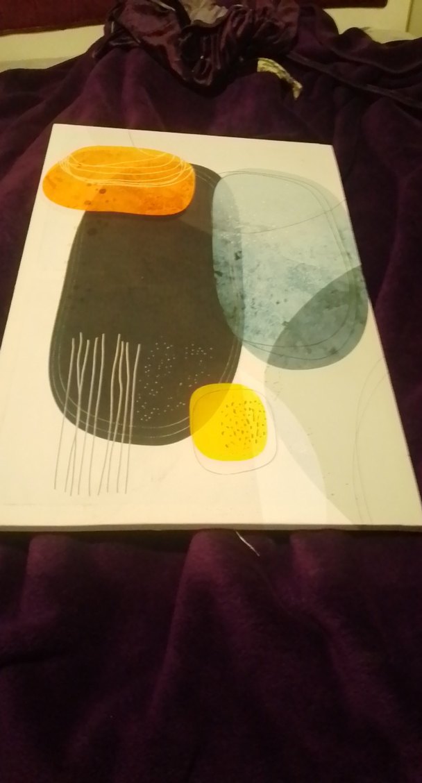 Bu tablo, beyaz zemin üzerinde turuncu, sarı, siyah ve mavi gibi koyu ve canlı renklerde soyut şekiller içerir.