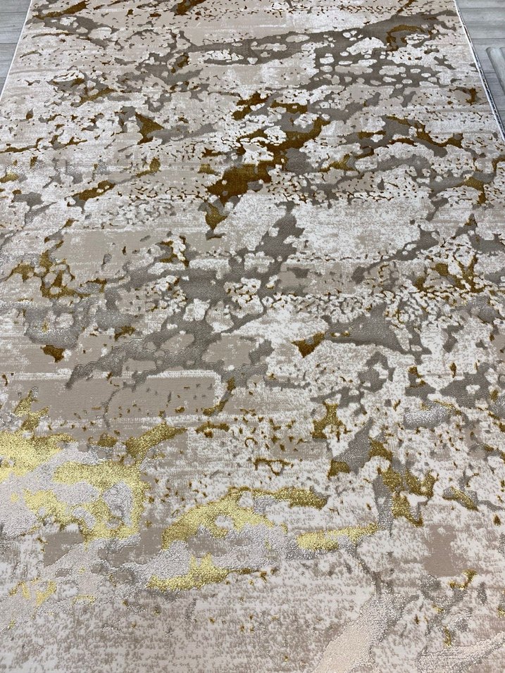 Bu modern halı, altın ve gri tonlarında soyut desenlere sahiptir. Dokulu yüzeyi ile mekana derinlik ve şıklık katar.