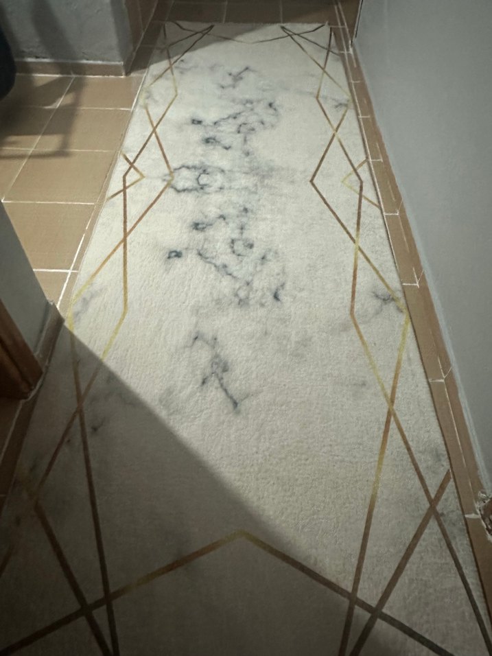 Bu çağdaş halı, beyaz ve gri tonlarda soyut desen ve ince geometrik çizgilerle modern bir dokunuş sağlar. Küçük bir deformesi vardır fotoğrafta 100x300 metredir