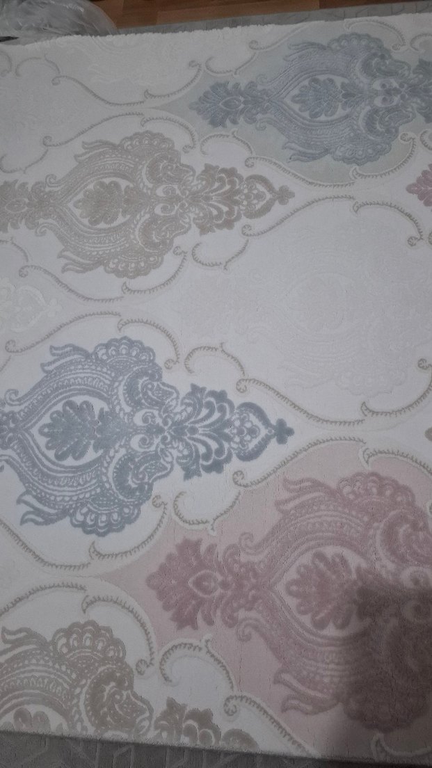 Bu beyaz halı, açık mavi, pembe ve bej tonlarında soyut desenlere sahiptir ve geleneksel bir tarza sahiptir. Her odaya zarif bir dokunuş katar. 4 m2 kalın.