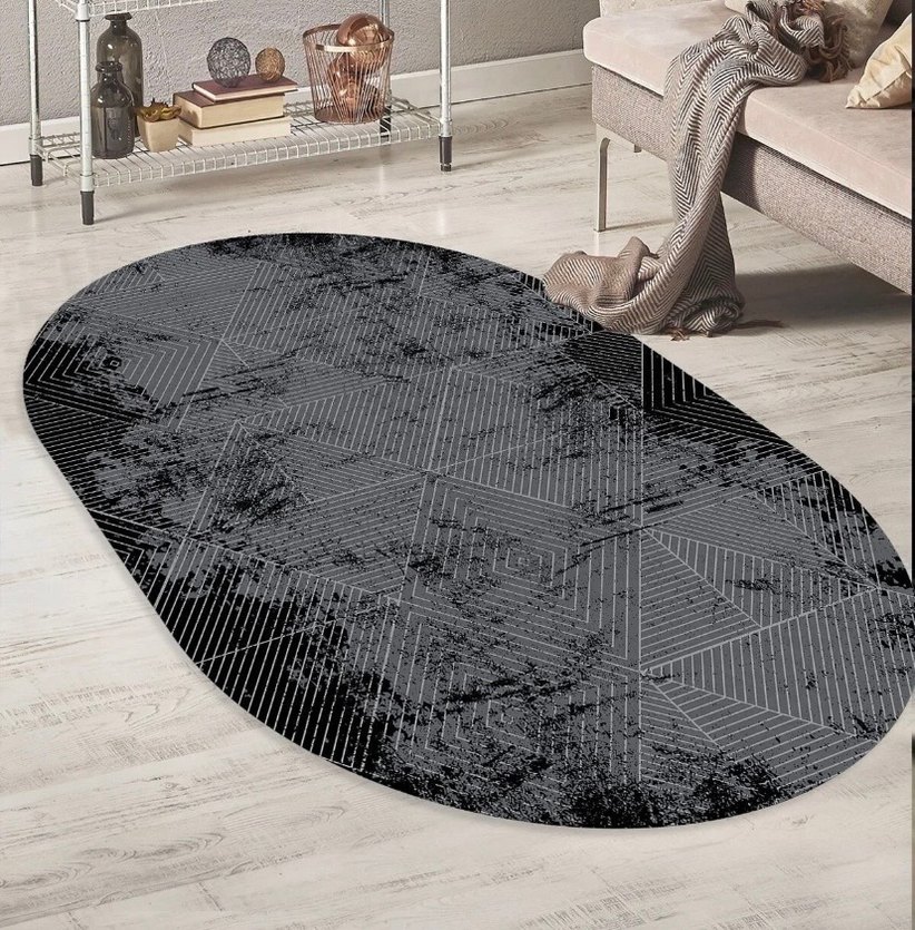 Gri ve siyah tonlarda soyut desenli oval halı, 140 x 200 ölçülerindedir . Hiçbir defosu yok sıkıldığım için satıyorum.