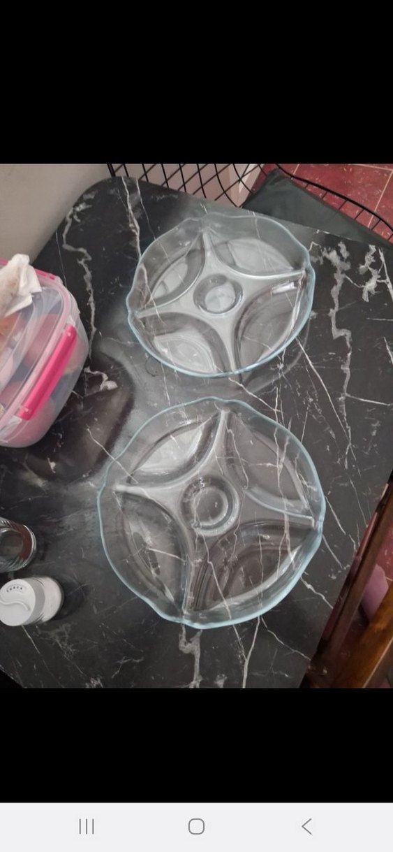 Soyut desenli, gri renkte cam servis tabakları. Çok bölmeli yapısıyla çeşitli sunumlar için uygundur. ️