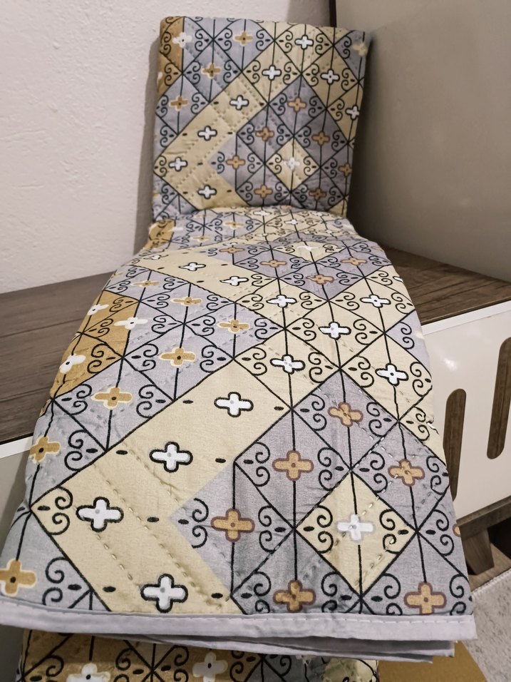 Gri ve bej tonlarında soyut desenlere sahip yatak örtüsü, geometrik şekiller ve hafif çiçek motifleriyle şık ve rahat bir görünüm sunar. ️ kapitone yatak örtüsü