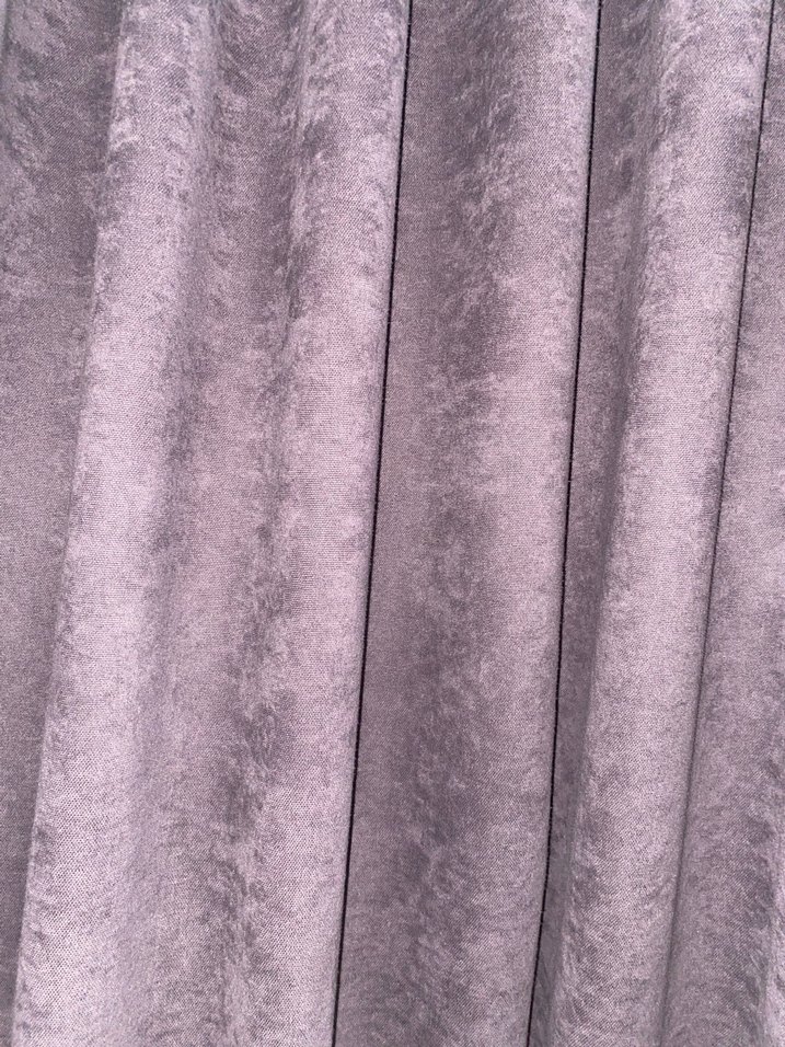 Bu modern perde, mor ve gri tonlarında soyut desenli yumuşak dokulu kumaştan üretilmiştir.