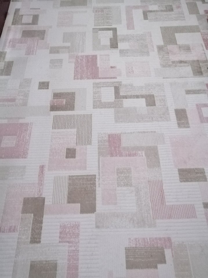 Modern tarzda, pastel pembe ve nötr tonlarda soyut desenli halı, mekana zarif bir dokunuş katar. 6 metrekare halıdan büyük