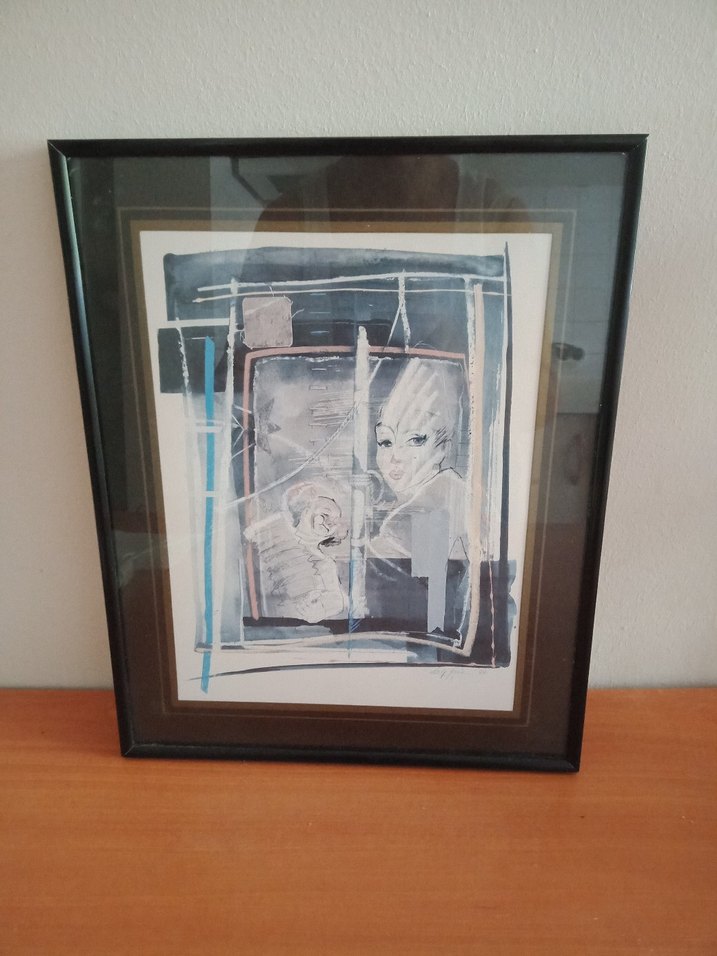Koyu gri tonlarda soyut figürler ve geometrik şekiller içeren çerçeveli tablo. Yumuşak ve keskin çizgilerle modern bir görünüm sunar. AYRANCILAR