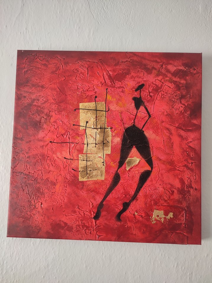 Koyu kırmızı zemin üzerinde siyah soyut insan figürlerinin yer aldığı, dokulu ve altın detaylı tablo. *İthal yağlı boya *Tablo temizliğinde kuru bez kullanınız.