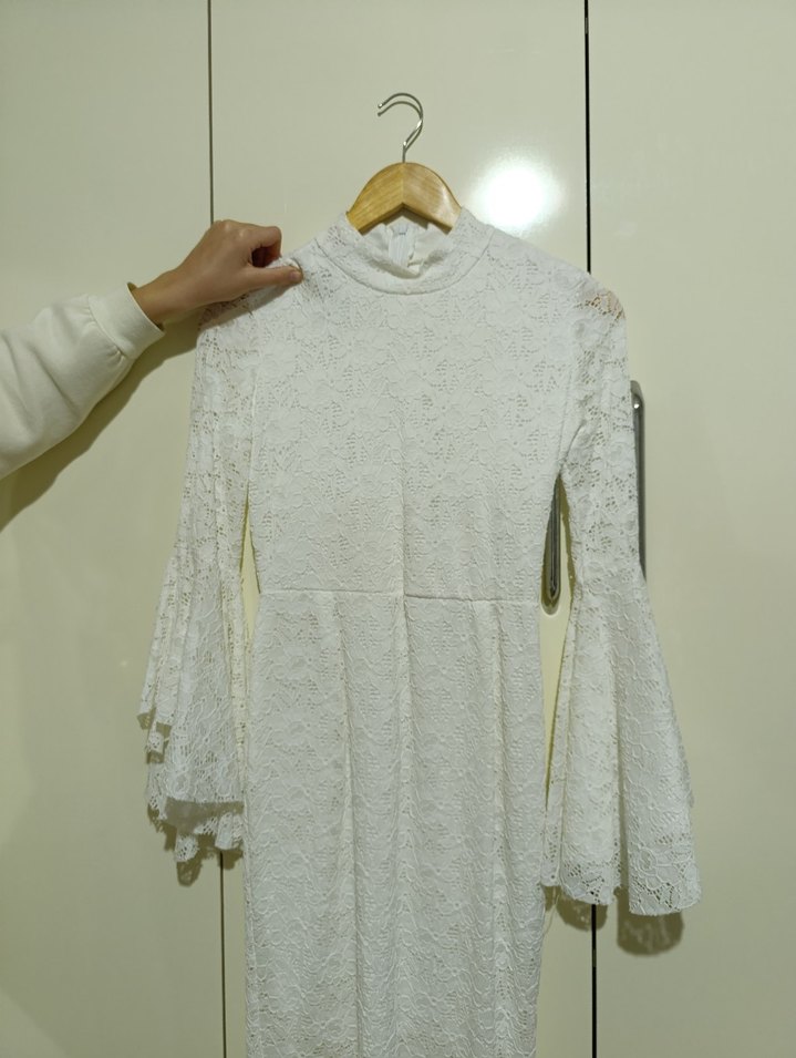 Beyaz midi elbise, yüksek yakalı ve uzun dantelli kollu, klasik ve bohem tarzda. etiketi üstündedir ürün sıfır uzunluk 100 cm