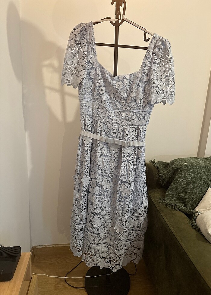 Evde nişan ve söz elbisesi olarak giyilebilir.40 beden 1 kere giyildi. Dantelli bebe mavisi midi boy