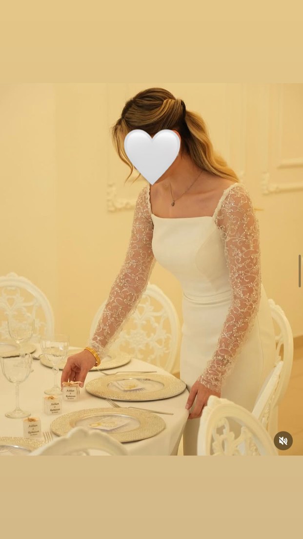 Bu beyaz ve vücuda oturan nişan elbisesi uzun dantel kollara sahip olup modern klasik ve Paris tarzını yansıtır. Midi boy ve desensiz tasarımıyla zamansız şıklık sunar. 36/38 beden için uyumludur