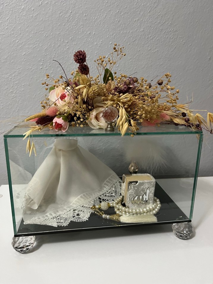 Cam kutu içinde beyaz dantel detaylı mendil,inci tespih,kolonya,kuran vardır.Kurutulmuş çiçekler ve kurdeleyle süslenmiştir.Ürünü nişanımızda almıştık öylece duruyor,fazlalık nedeniyle satıyorum.Satın alacak kişiye şimdiden hayırlı olsun,uğur getirsin