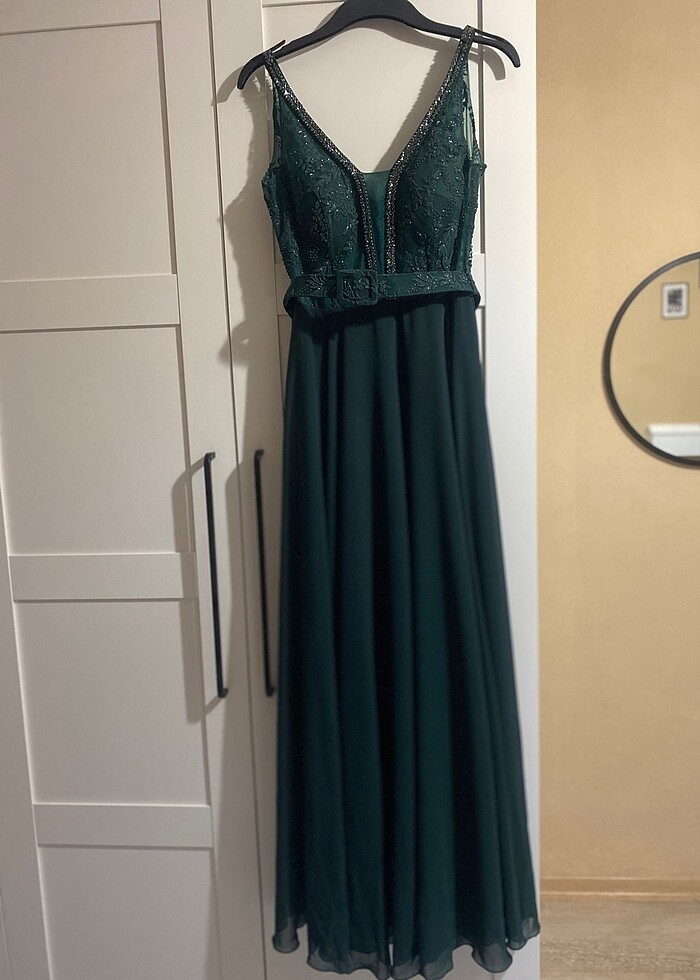 Sözümde 2 saat giydim herhangi bir deformesi yoktur. 38 bedenlede uyumludur. Üst kısmı hafif transparandır ben kendime göre içine tül diktirdim biraz kapattım ama yinede iç az belli oluyor, yanında yeşil tacı hediye olarak göndereceğim
