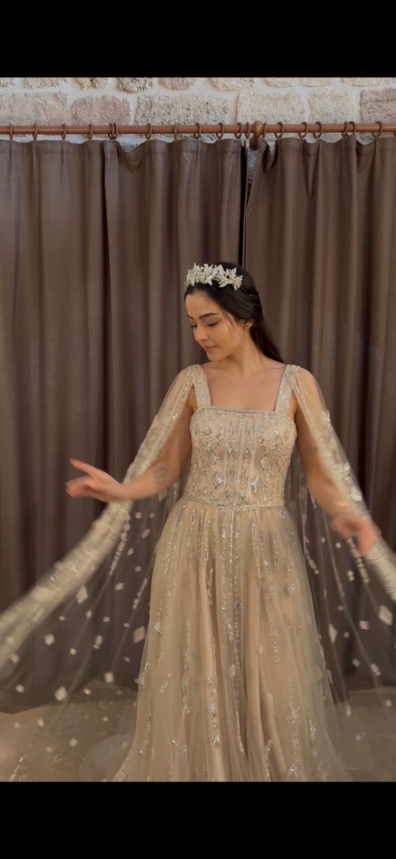 Satılık fiyatıdır kişiye Özel dikim kolları pelerinli işlemeli bir elbisedir. 36 38 ve 40 bedene olur arkası ipli Tarlatan ya da tarlatansız kullanabilirsiniz her renk ve modelde özel dikim çalışıyoruz