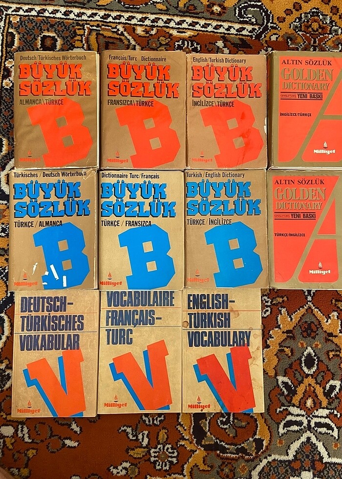 1990 basımı, milliyet gazetesi dağıtımı İngilizce - Almanca - Fransızca sözlükler ve ekstra konuşma rehberleri. Sayfalarında ve ciltlerinde yırtık ve yıpranma yoktur, sayfalar tam eksiksizdir.