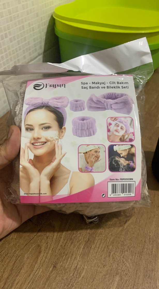 Spa, makyaj ve cilt bakımında kullanılmak üzere yumuşak kumaştan yapılmış saç bandı ve bileklik seti. Yay şeklinde saç bandı ve uyumlu bileklikler içerir.