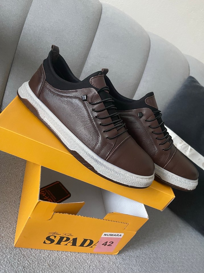 SPAD marka, kahverengi deri, tokalı ve beyaz tabanlı 42 numara günlük erkek ayakkabısı.