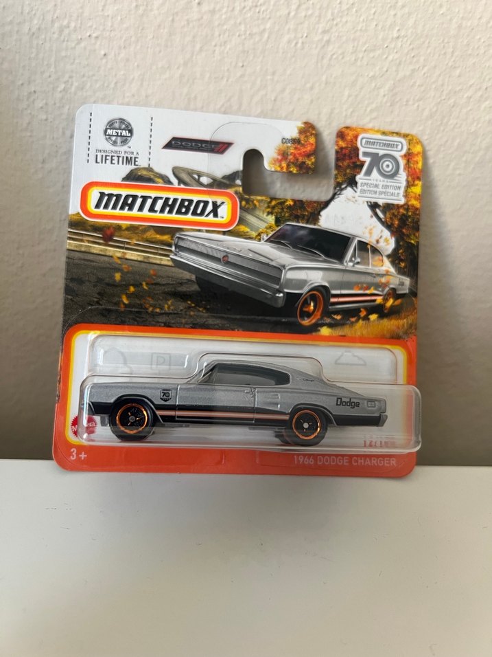 Gri renkli Matchbox 1966 Dodge Charger oyuncak araba, metal detaylı yapısı ve ömür boyu dayanıklılık garantisi ile 70. yılını kutluyor.