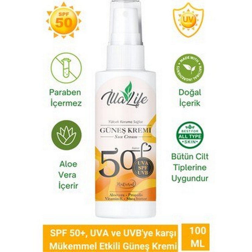 SPF 50+ koruma sağlar, UVA ve UVB ışınlarına karşı etkilidir. Aloe vera içerir, paraben içermez ve tüm cilt tiplerine uygundur. 100 ml boyutundadır. ☀️