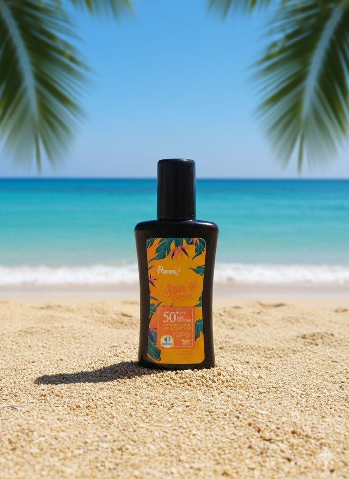SPF 50 yüksek koruma sağlayan güneş koruyucu losyon, plajda kullanıma uygun şişede.