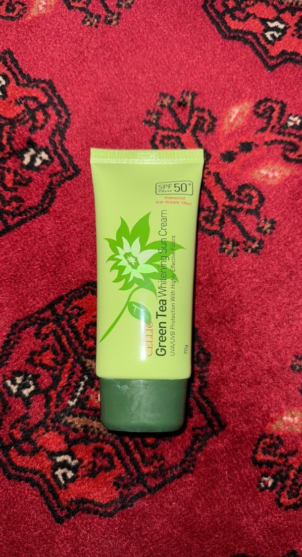 SPF 50 korumalı yeşil çay özlü beyazlatıcı güneş kremi, UVA/UVB koruması ve kırışıklık önleyici etkiler sunar.
