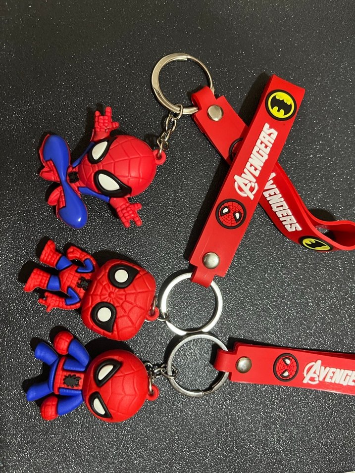 Kırmızı kurdeleye bağlı, Avengers logolu renkli Spider-Man anahtarlıklar. Biker tarzı ve rock punk esintili tasarım. ️