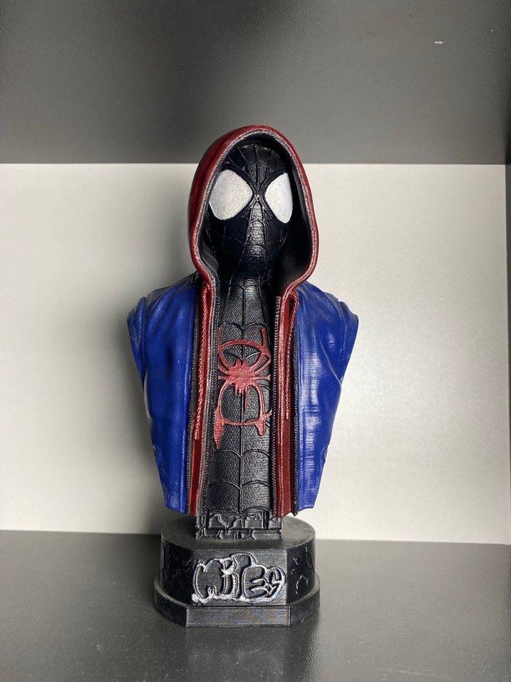 Karanlık mavi renkte, kapüşonlu ve göğsünde örümcek amblemi bulunan aksiyon figürü. Detaylı dokulara sahip ve dekoratif bir taban üzerinde duruyor. ️ Spiderman yüksek kaliteli PLA baskı figür