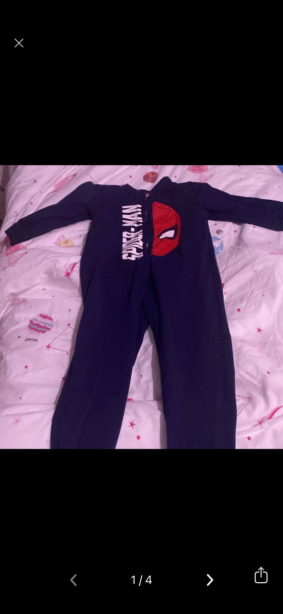 Uzun kollu, yüksek yakalı ve fermuarlı, fitted kesim koyu mavi erkek çocuk pijaması. Üzerinde Spiderman baskısı bulunur. ️