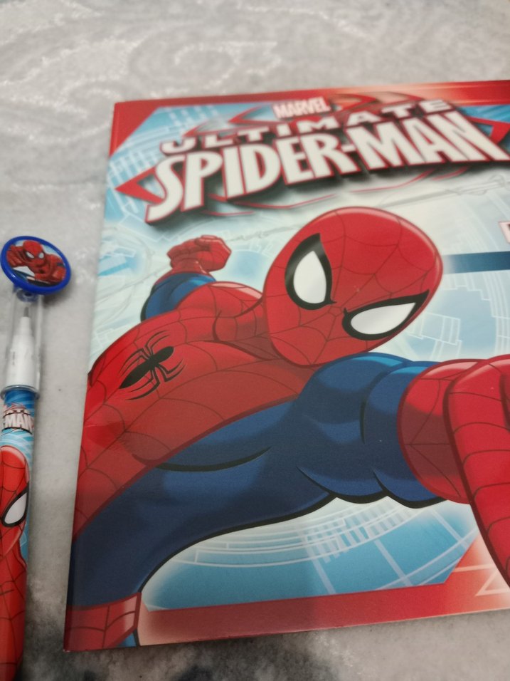 Marvel Ultimate Spider-Man çizgi romanı, ikonik süper kahramanı aksiyon halinde gösterir ve Spider-Man temalı bir kalemle birlikte gelir. ️