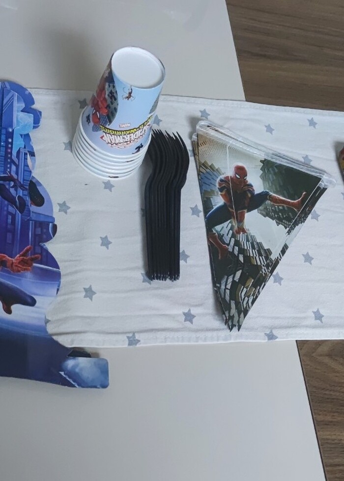 6 parça ürün bulunmaktadır kullanılmadı Kek stantdı,iyi doğdun yazısı,flama,bardak,çatal,masa örtüsü
