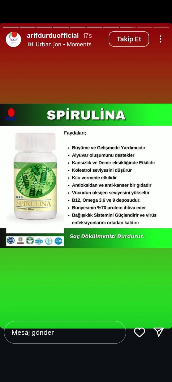 Spirulina tabletleri büyümeye, alyuvar oluşumuna destek olur, kansızlık ve demir eksikliğini azaltır. Kolesterolü düşürür, kilo vermeye yardımcı olur, vücudun oksijen seviyesini yükseltir. B12, Omega 3, 6 ve 9 deposudur. Bağışıklık sistemini güçlendirir, enfeksiyonları ortadan kaldırır ve saç dökülmesini durdurur. Antioksidan ve anti-kanser özelliktedir.