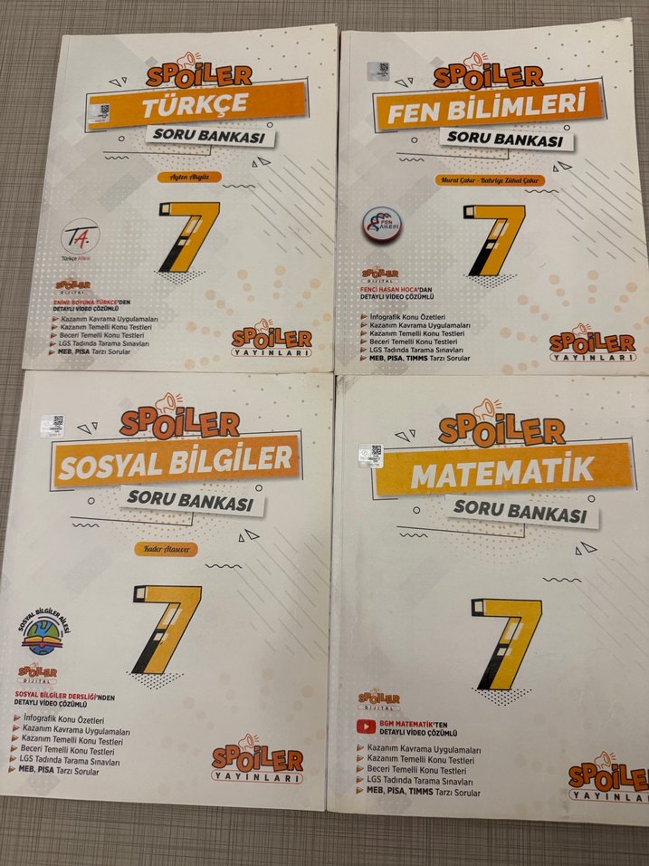Spoiler Yayınları'ndan 7. sınıf Türkçe, Fen Bilimleri, Sosyal Bilgiler ve Matematik soru bankaları seti.