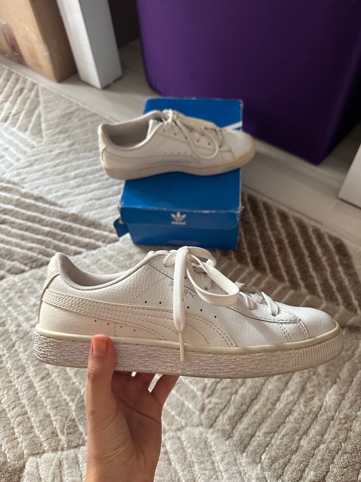 Pastel tonlarda beyaz, bağcıklı ve platform topuklu spor ayakkabı. Kauçuk malzemeden, sportif ve günlük sokak stiline uygun. Puma orjinal ürünüdür herhangi bir yırtık vs deformesi yoktur
