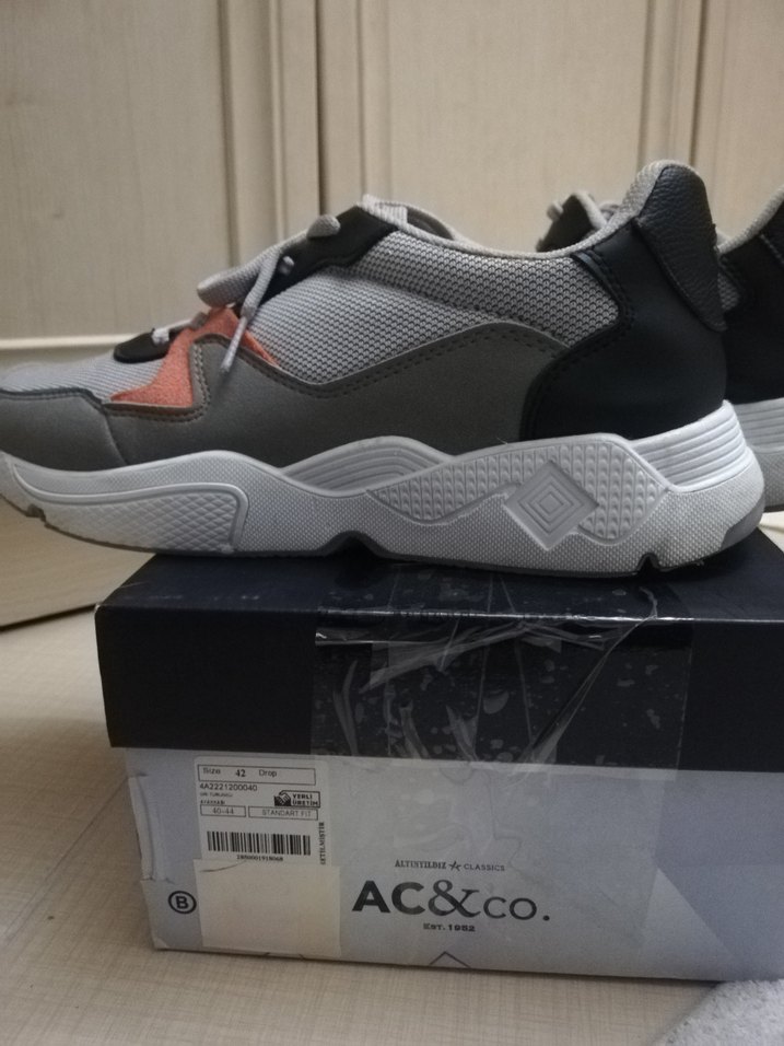 Gri renkli, bağcıklı ve blok topuklu spor ayakkabı. Baskılı detaylara sahip, kauçuk tabanlı, AC&co. marka. Yumuşak tabanlı rahat ayakkabı nefes alan kumaş terletme yapmaz kaymaz tabanlı temizlenmiş koku kirlenme yoktur cok az giyilmiş