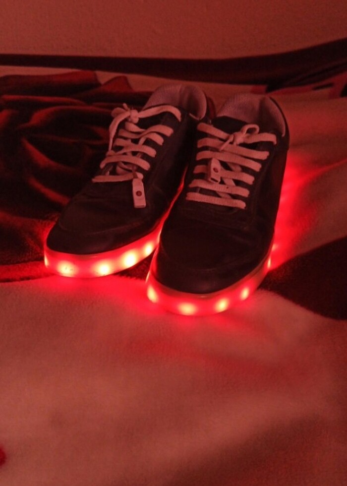 ÜRÜNÜ BİR KAÇ KEZ KULLANDIM KUTUDA KALA KALA IŞIKLARIN YARISI HASAR GÖRDÜ TAMİR EDİLE BİLİR SOL AYAKTA OLAN IŞIK DÜĞMESİ ZOR BASIYOR KAPANMADIĞI ZAMAN ŞARJA TAKİP KAPATIYORUM SAMSUNG ŞARJ ALETİ İLE ŞARJ EDİLE BİLİR 9 FARKLI RENK SEÇENEĞİNE SAHİP ÜÇ FARKLI RENK DEĞİŞTİRİCİ ÖZELİĞİ İÇİ TER TEMİZ DOĞRU DÜZGÜN KULLANILMADI ARKA KISMINDA NİKE YAZISINI AYAKKABICIDAN KAPATMASINI İSTEMİŞTİM ÜRÜN TEMİZ YENİ