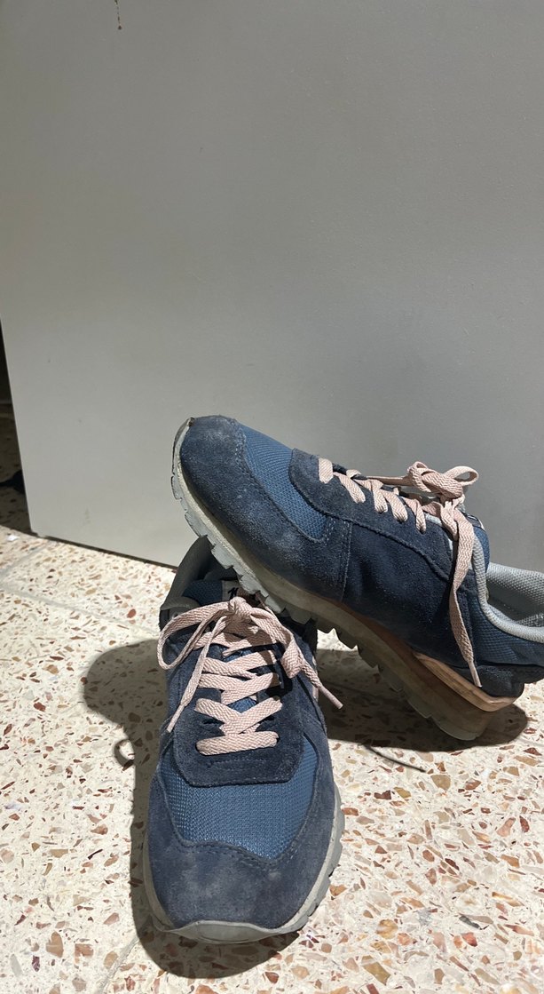 Mavi denim kumaştan, gündelik kullanım için rahat ve şık kadın spor ayakkabısı.