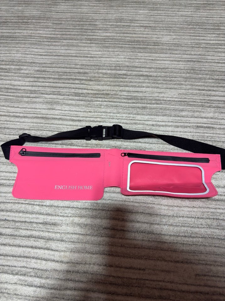 Pembe renkli, baskılı ve kemerli spor bel çantası, şeffaf cep ve ENGLISHHOME marka yazısı içerir.