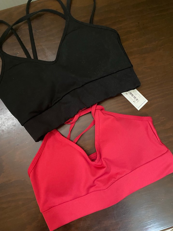 Kırmızı ve siyah renklerde, kısa boylu, desensiz, askılı detaylara sahip athleisure sütyenler. Street wear stiline uygun, rahat ve destekleyici.Kırmızı olan etiketli diğeri 1 defa giyildi sıkı geldiği için satıyorum. Xs ve S bedene çok daha uygun.Manche marka.