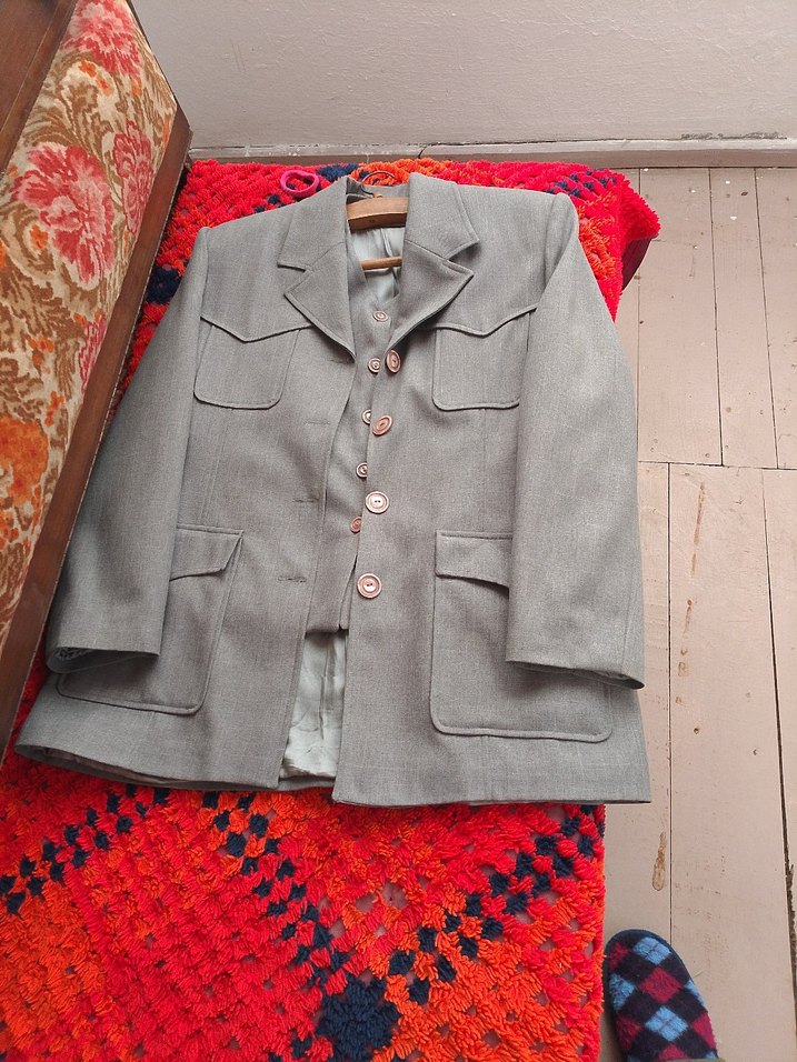Gri renkli, düğmeli, uzun kollu ve notched lapel yaka detaylı erkek ceketi. Vintage tarzı ve ofis kullanımı için uygun, rahat kesim.