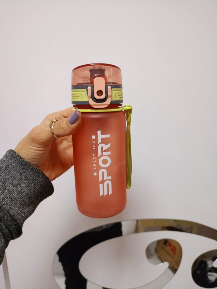 Renkli kırmızı spor çocuk termos şişesi, güvenli açılır kapak ve kolay taşınabilir kayış içerir.
