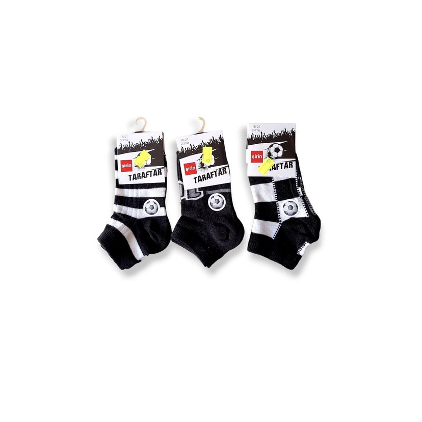 Renkli, kısa ve vücuda oturan erkek spor çorapları, futbol topu ve "TARAFTAR" yazılı baskılar içerir. ⚽ Ürün Şirin markasına ait #orijinal lisanslı #Beşiktaş çocuk çorabıdır. İlan fiyatına 3adet çorap içindir. Asenora İçgiyim mağazamızda satılan serili mağaza ürünüdür. Pamuk çoraptır. Ter emer, nefes alır. 2-3, 7-8, 9-10, 11-13 yaşları mevcuttur. Galatasaray ve Fenerbahçe'nin orijinal lisanslı çoraplarını da sayfamızda bulabilirsiniz.