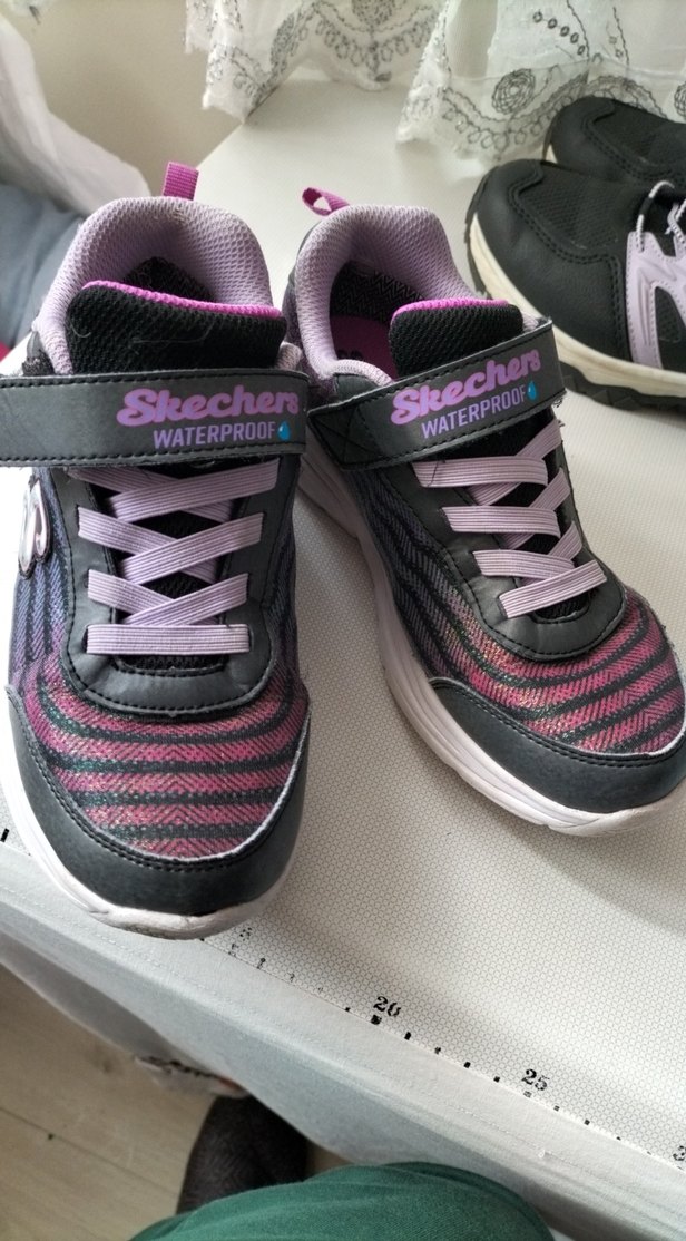 Mor renkli, bağcıklı ve velcro kapamalı, Skechers marka su geçirmez kız spor ayakkabısı. Tie-dye desenlidir.