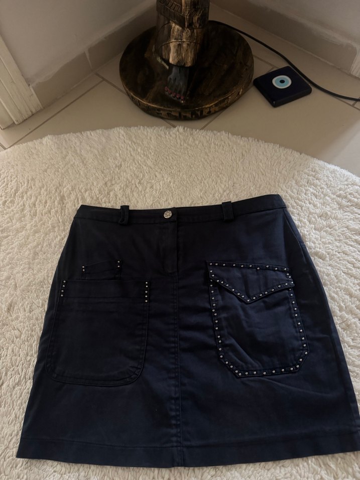 Lacivert renk keten kumaş hiç bir defosu yok. Önde 3 cep metal işlemeli arka 1 cep metal detay spor şık etek Ölçü : Bel 40 cm. Basen 47 Boy 43