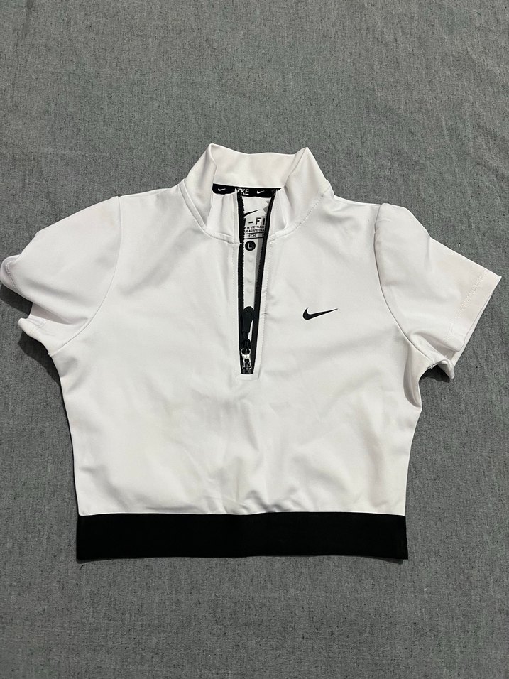 Beyaz crop top, polo yaka ve kısa kollu. Sentetik kumaştan, vücuda oturan ve kısa kesim. Spor şıklığı için baskılı detaylara sahip. ⚡