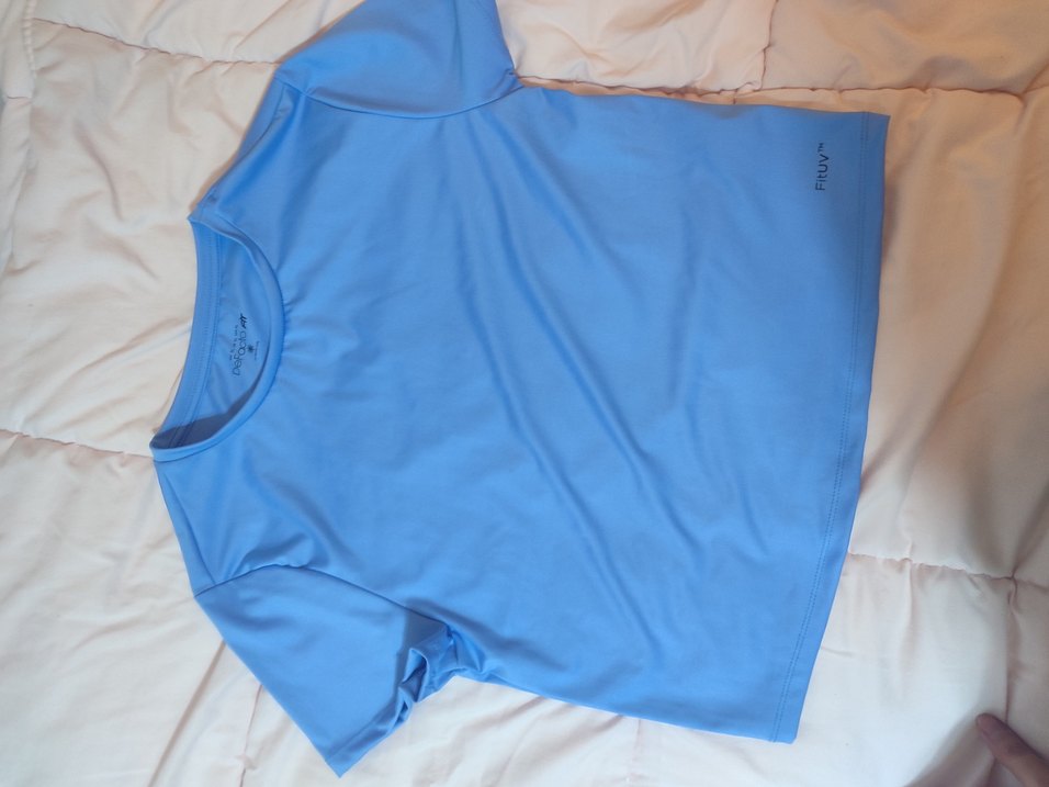 Mavi pastel renkte, kısa kollu ve yuvarlak yakalı, rahat sentetik kumaştan yapılmış dar kesim hamile tişörtü. Spor ve günlük giyime uygun.